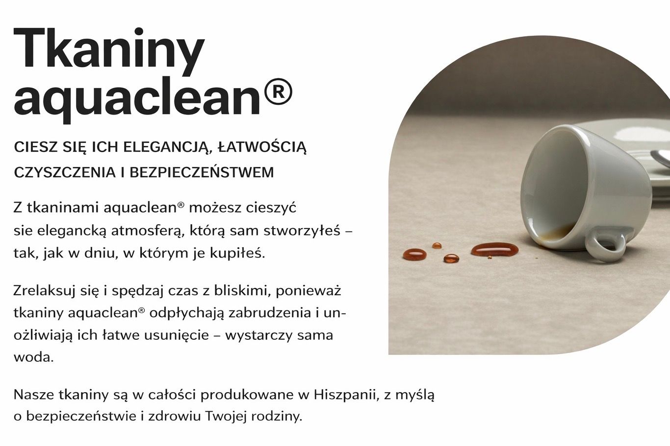 Technologia aquaclean® to rewolucyjne wykończenie tkanin, pozwalające na usuwanie plam za pomocą samej wody. Pozwala na łatwą i niezajmującą czasu konserwację tkanin.