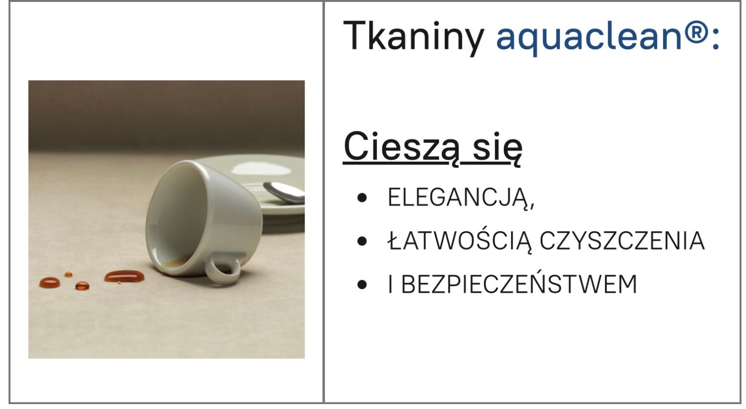 Tkaniny aquaclean® posiadają podwójną ochronę w postaci odpychania i ekstrakcji, która chroni przed plamami płynnymi i stałymi.